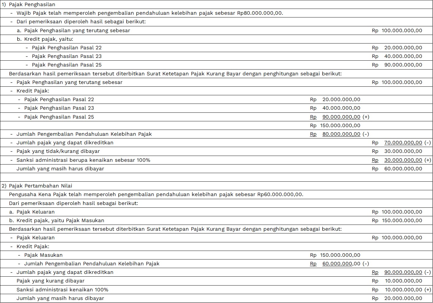 Surat Ketetapan Pajak Kurang Bayar adalah surat ketetapan pajak yang menentukan besarnya jumlah pokok pajak, jumlah kredit pajak, jumlah kekurangan pembayaran pokok pajak, besarnya sanksi administrasi, dan jumlah pajak yang masih harus dibayar. ***)